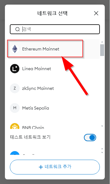 이제 다시 메타마스크 왼쪽 상단에서 체인 선택을 눌러서 이더리움으로 돌아옵니다.