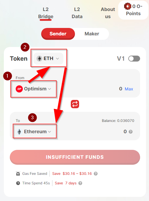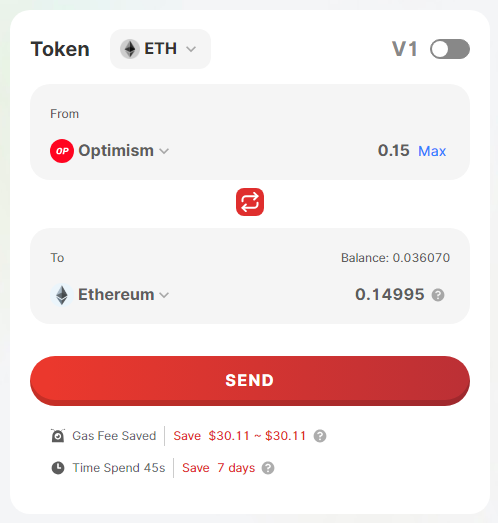 From 체인은 옵티미즘, To 체인이 이더리움인지 확인하세요. 다르다면 선택하시면 됩니다.