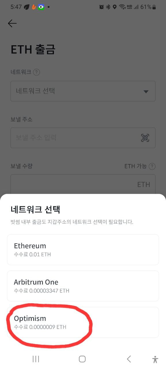 일단 옵티미즘으로 선택하시고, 빗썸에 미리 등록하신 개인지갑으로 출금을 진행합니다.