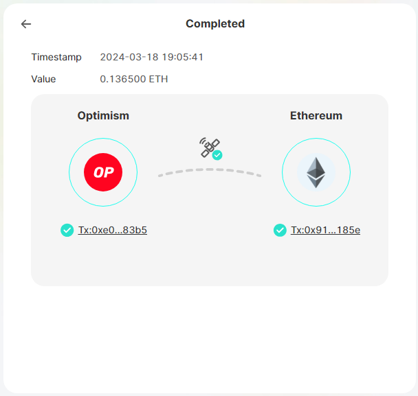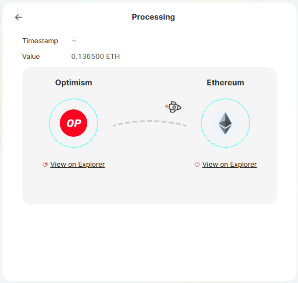 옵티미즘에서 이더리움으로 전송되고 있는 모습이 애니메이션으로 보여집니다.