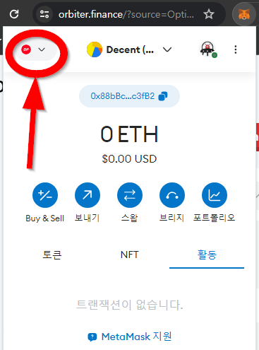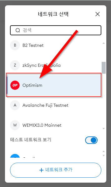 여러가지 체인이 보여질 텐데요. 우리는 옵티미즘으로 출금을 했으니 이를 선택합니다.