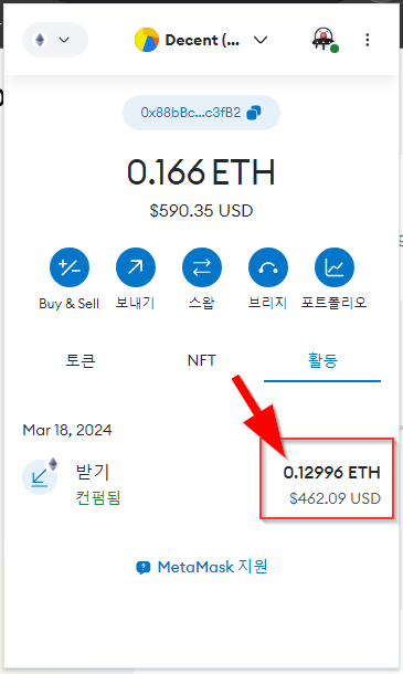 이제 개인 지갑 (Metamask) 로 이동해서 입금 상황 살펴봅니다.
